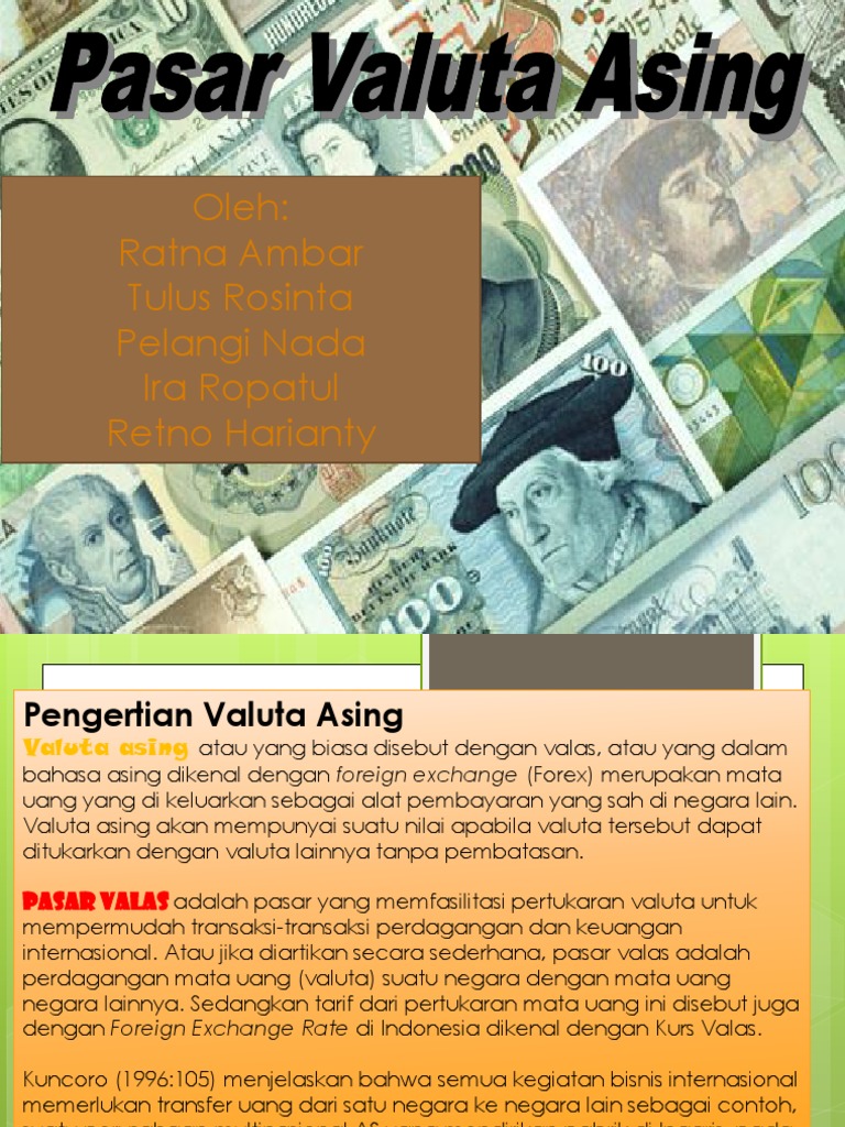 Valuta Asing Adalah - Pasar Valuta Asing / Kurs dan kuotasi valuta asing kurs valuta asing adalah harga suatu mata uang yang dinyatakan dalam mata uang lain.. Valuta asing akan mempunyai suatu nilai apabila valuta tersebut dapat ditukarkan dengan valuta transaksi spot adalah pembelian atau penjualan mata uang asing dengan kurs yang berlaku dipasar. Jadi kurs valuta asing adalah perbandingan nilai atau harga antara mata uang asing yang dinyatakan atau ditukar dengan nilai mata uang domestik. Pasar valuta asing atau valas adalah jenis perdagangan (transaksi) yang memperdagangkan. Secara mudahnya, valas adalah pertukaran atau konversi mata uang suatu negara dengan negara lain. Accurate adalah software akuntansi berbasis cloud yang sudah digunakan oleh lebih dari 300 ribu entitas bisnis dan.